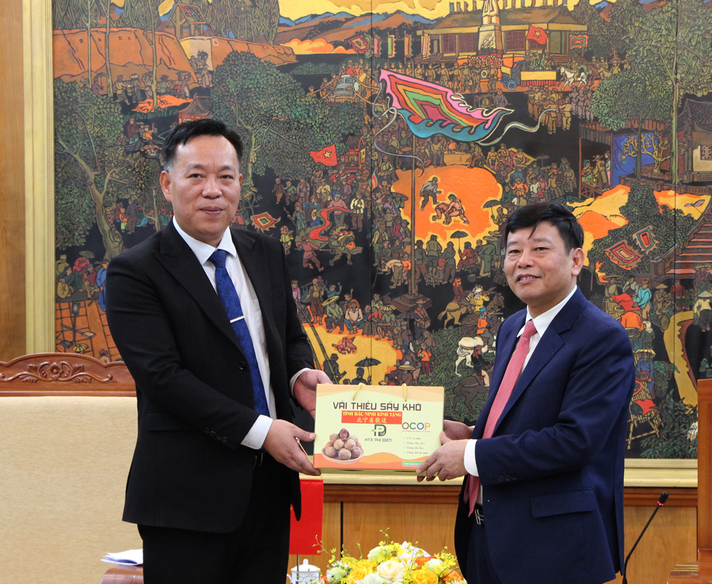 Nhân dịp này, đồng chí Ngô Tân Phượng tặng đoàn công tác một số sản phẩm đặc trưng của tỉnh như: Tranh dân gian Đông Hồ, vải thiều sấy khô.